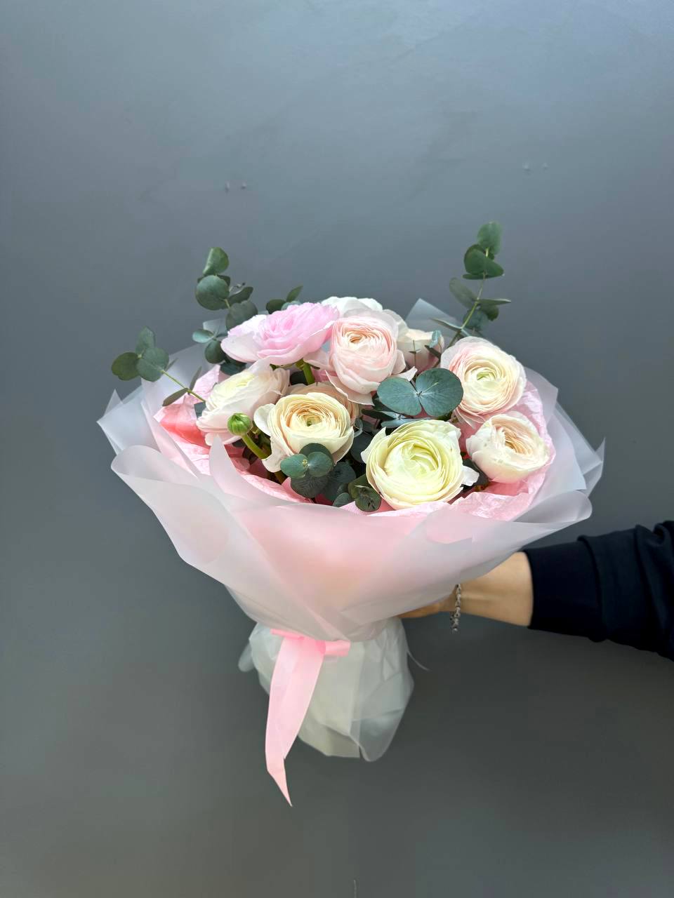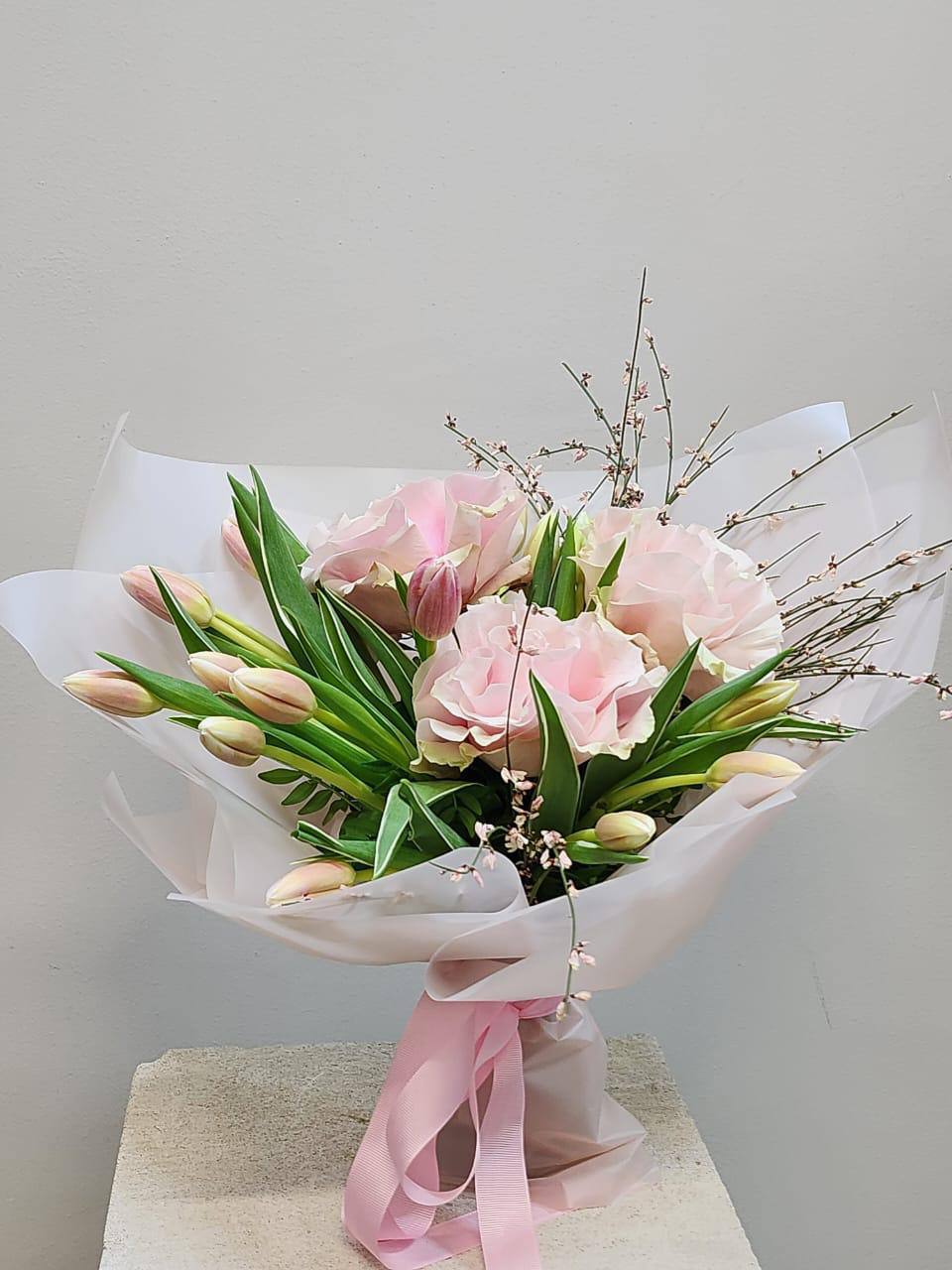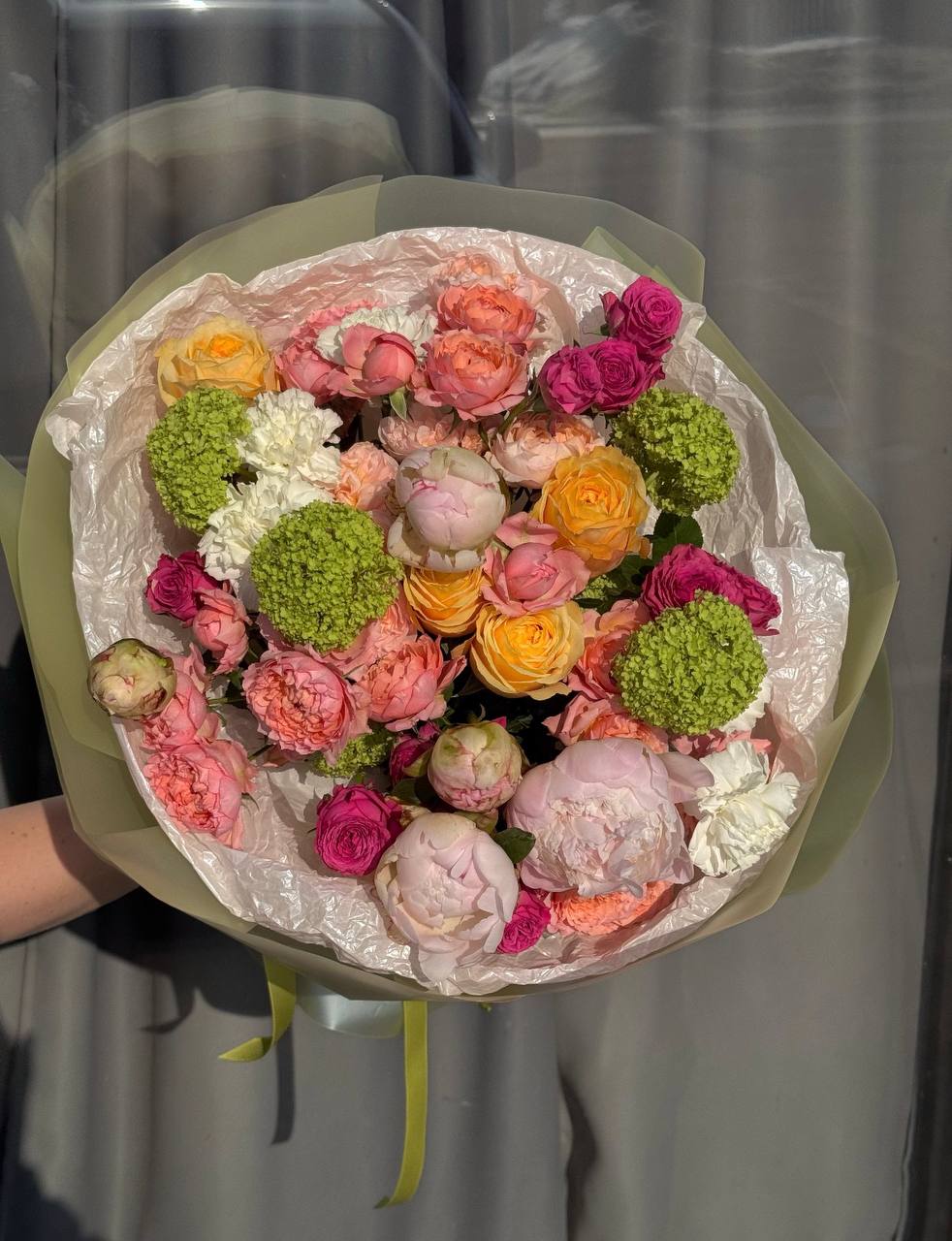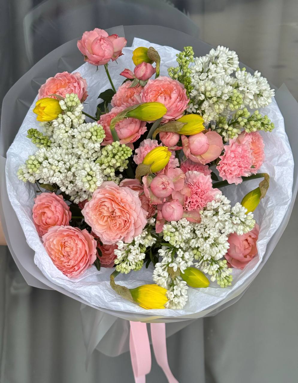 Нежная композиция из пионовидных роз персикового оттенка, дополненная веточками белой сирени и яркими нарциссами . Изящное сочетание пастельных и насыщенных тонов — для особого настроения.