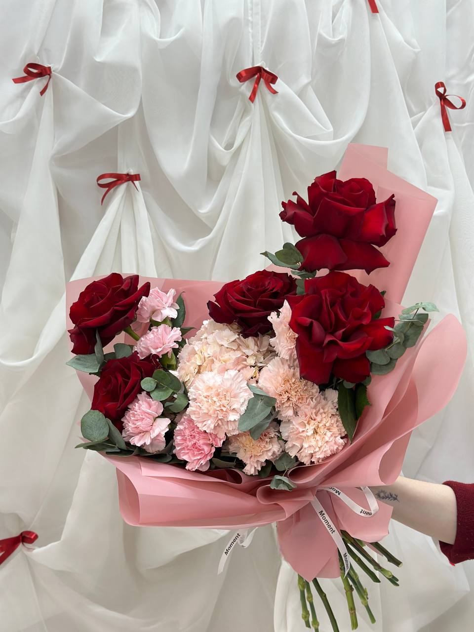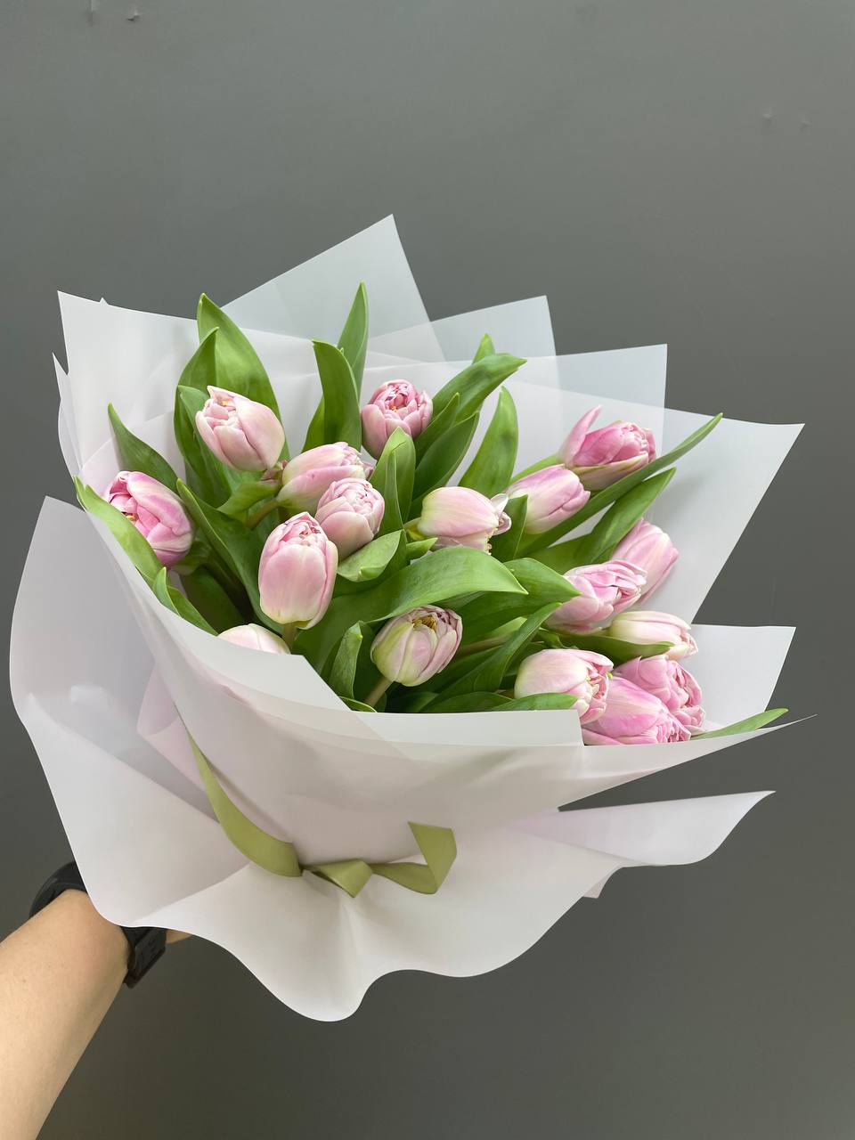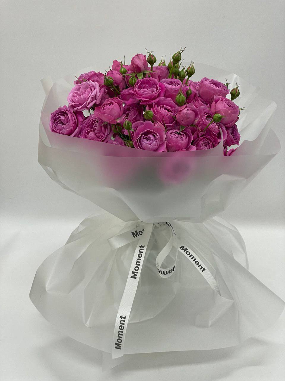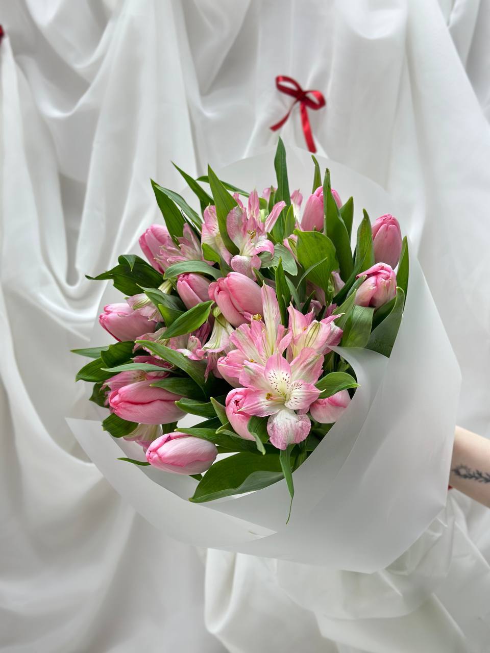 Нежная композиция из пионовидных роз персикового оттенка, дополненная веточками белой сирени и яркими нарциссами . Изящное сочетание пастельных и насыщенных тонов — для особого настроения.