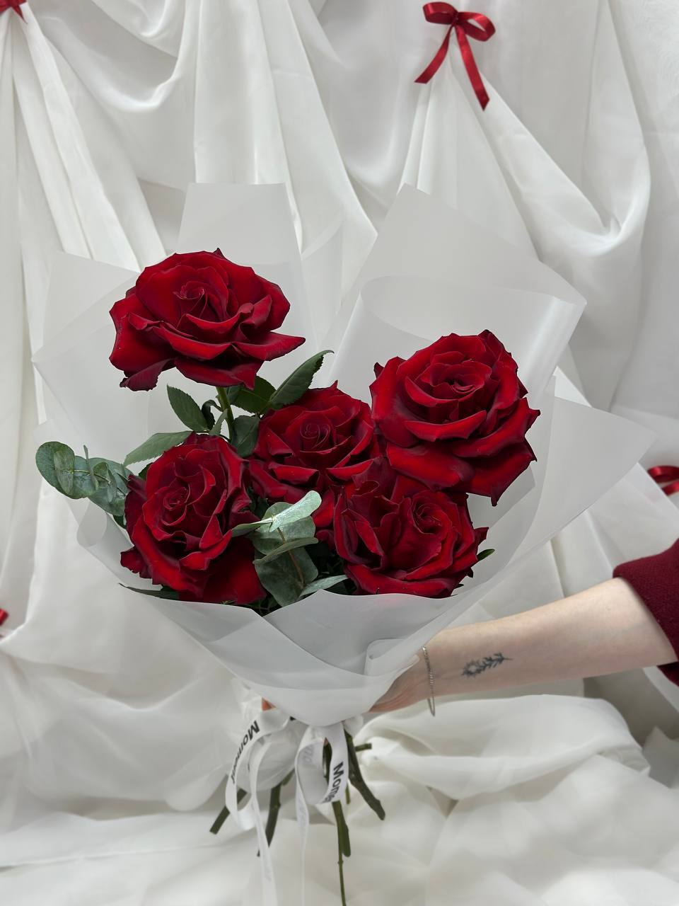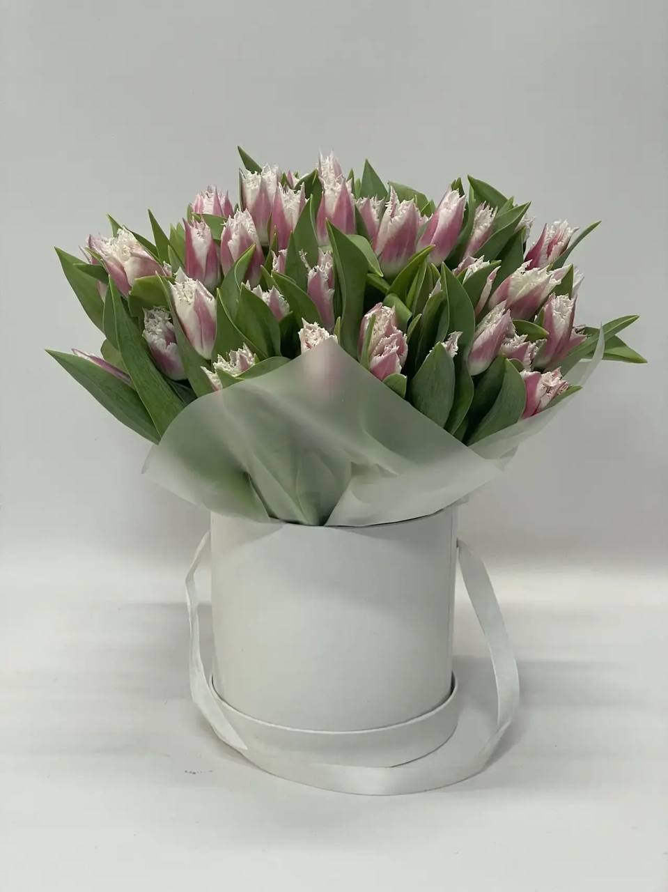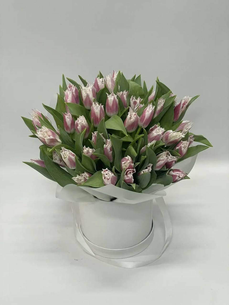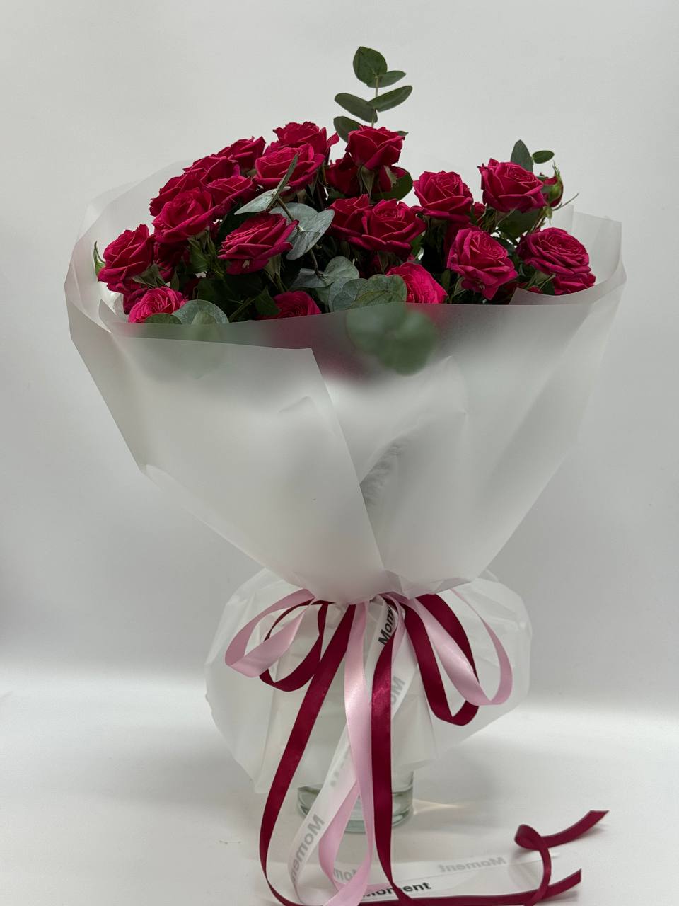 Нежная композиция из пионовидных роз персикового оттенка, дополненная веточками белой сирени и яркими нарциссами . Изящное сочетание пастельных и насыщенных тонов — для особого настроения.
