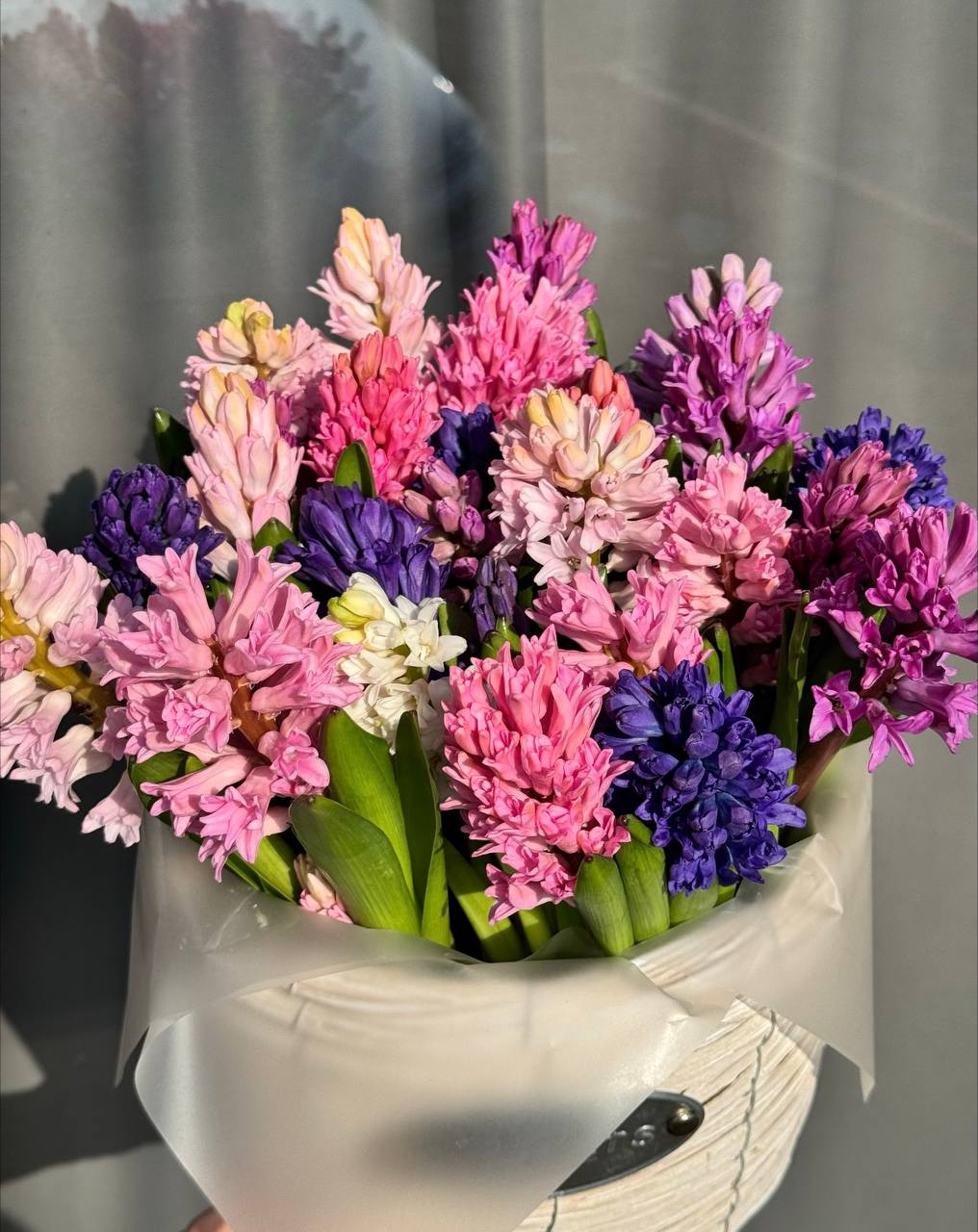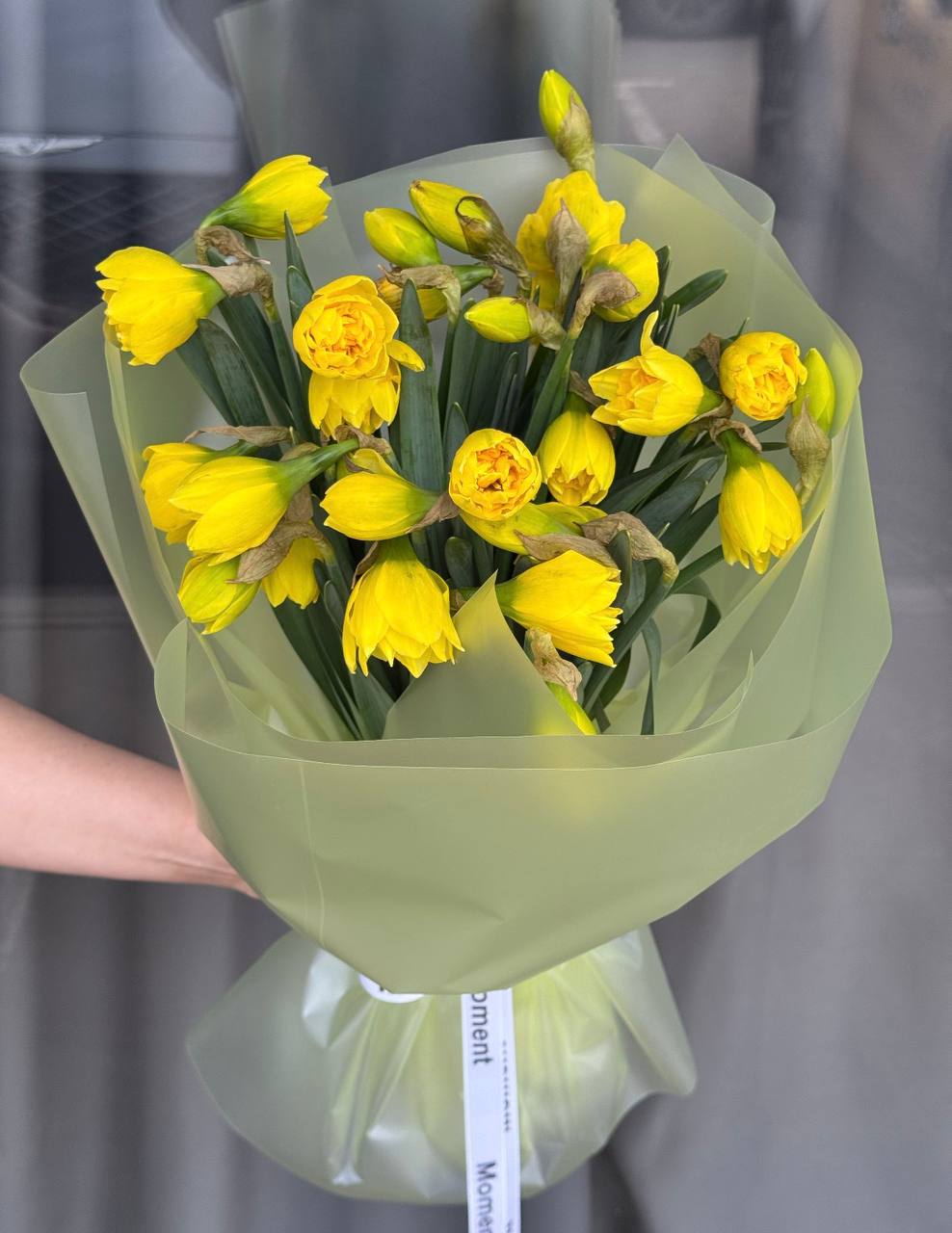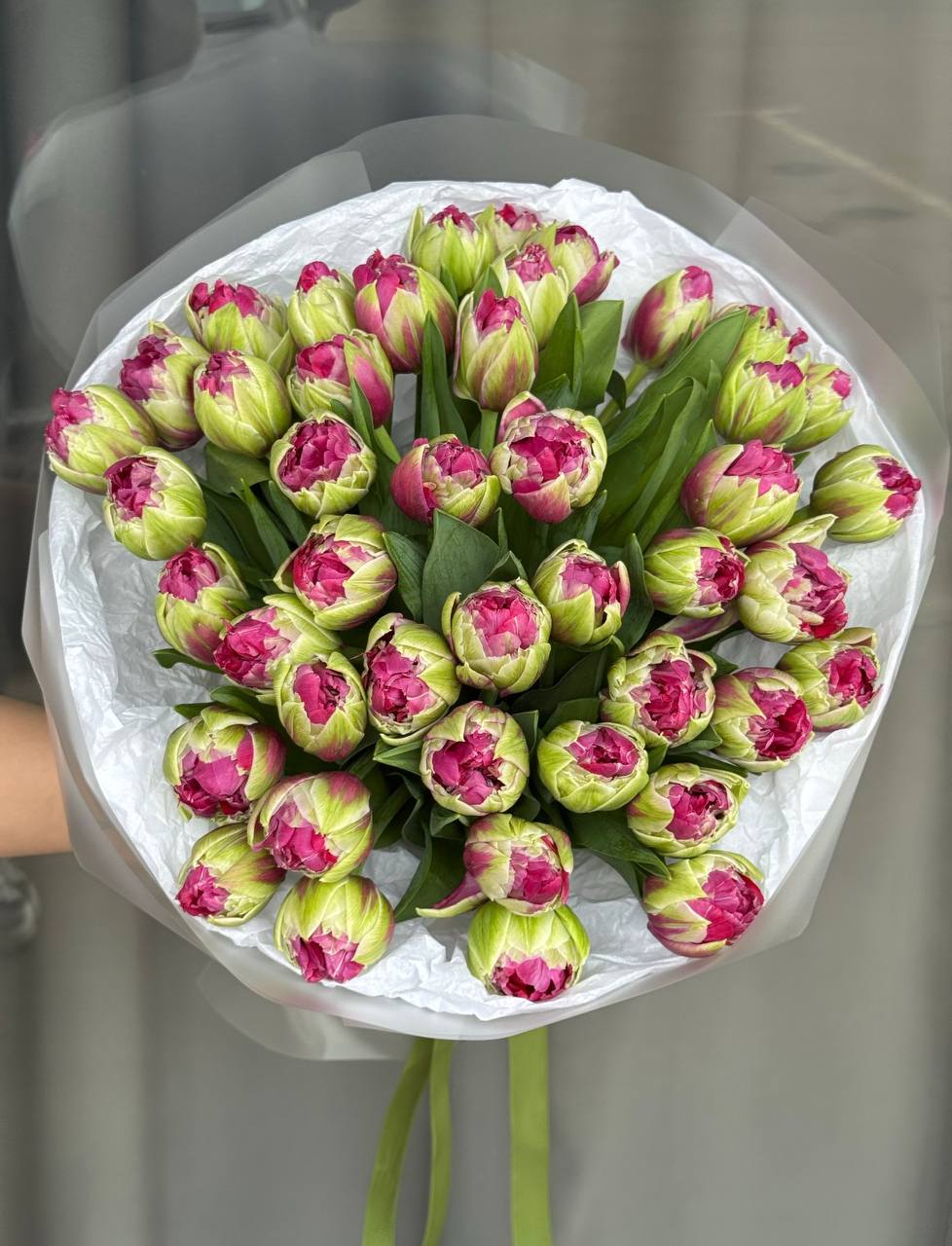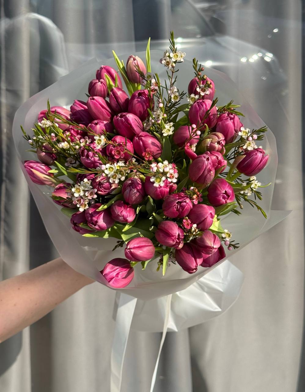 Монобукет ранункулюсов в полупрозрачной упаковке — лаконично и стильно.